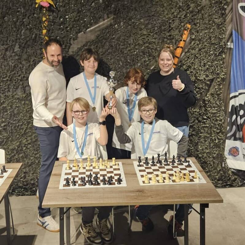 Woensdag 26-2 op een zonnige woensdag staan 3 teams van school kiemkade te trappelen om mee te doen aan het school schaak toernooi van west brabant te Roosendaal. 74 teams doen er mee en een team bestaat uit 4 spelers. Vol zenuwen komen onze teams aan in de chaos van 300 schakertjes die allemaal met de cup naar huis willen en vol goede moed starten ze de eerste ronde op deze zonnige woensdag. De eerste ronde winnen de eerste 2 teams met 4-0 en ze stijgen naar de hoogste borden, nadat na de tweede ronde het tweede team met 2-2 gelijk speelde en het eerste team met BSV speler lexi op het eerste bord weer met 4-0 won kwam dit team op het eerste bord te spelen en gaf dit het toernooi niet meer weg. Vervolgens werd er met 3-1, 3,5-0,5 en nog een keer 3,5-0,5 gewonnen met nog 2 rondes te gaan. Aangezien het tweede team van kiemkade ook bleef winnen en na ronde 5 kiemkade 1 op 1 stond en kiemkade 2 op 2 mochten ze in de 6e ronde tegen elkaar spelen, wat na een spannende strijd in 2-2 eindigde… nog 1 ronde te gaan en anderhalve punt was zeker genoeg om eerste te worden, ingewcht wat de andere uitslagen zouden worden. Het tweede team had aan 2 punten genoeg om zich ook te plaatsen. Team 1 won met 3,5-0,5 en eindigde op de eerste plek met 3,5 punten voorsprong op de nr 2, het tweede team verloor helaas met 3-1 en eindigde op een gedeeld 3e plaats maar viel buiten de top 3 op onderling resultaat, maar alle 3 de teams in de top 6!! Leuk dat de tweede plek uiteindelijk door school Lodijke uit bergen op zoom werd veroverd en een tweede BSV lid (Lars) ook naar de brabantse kampioenschappen mag!!๐๐